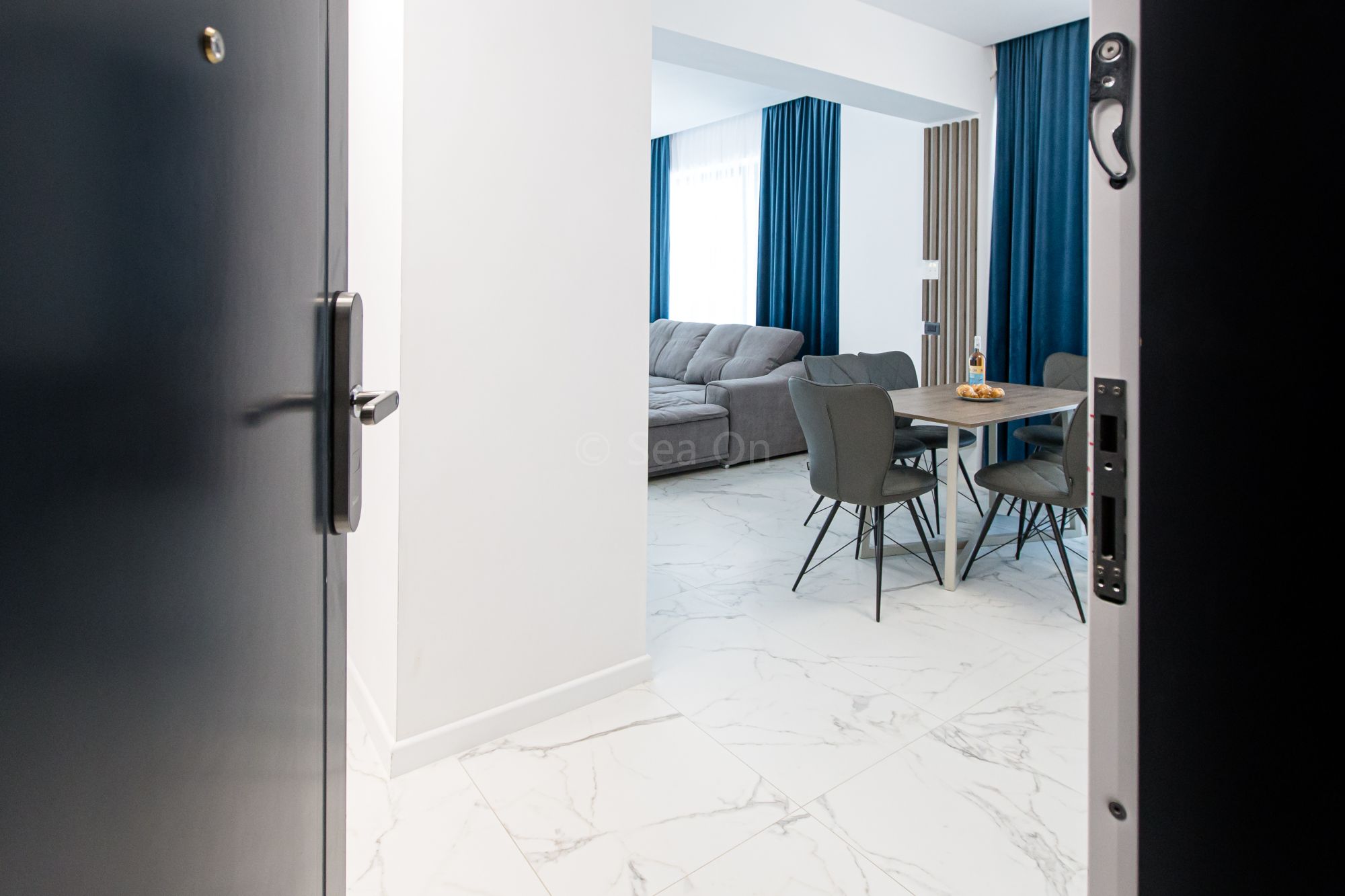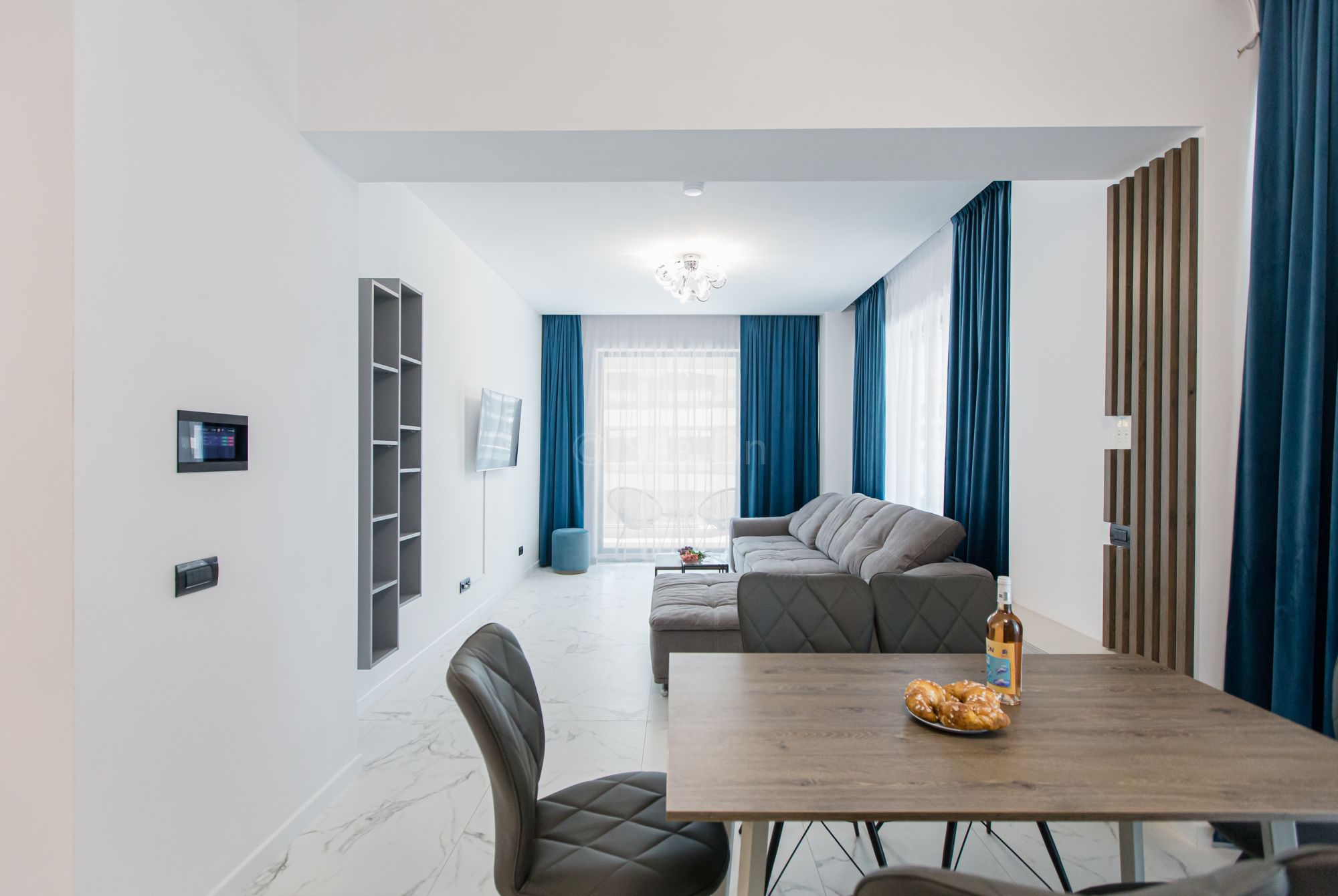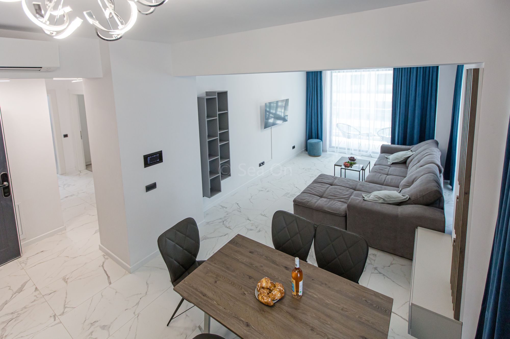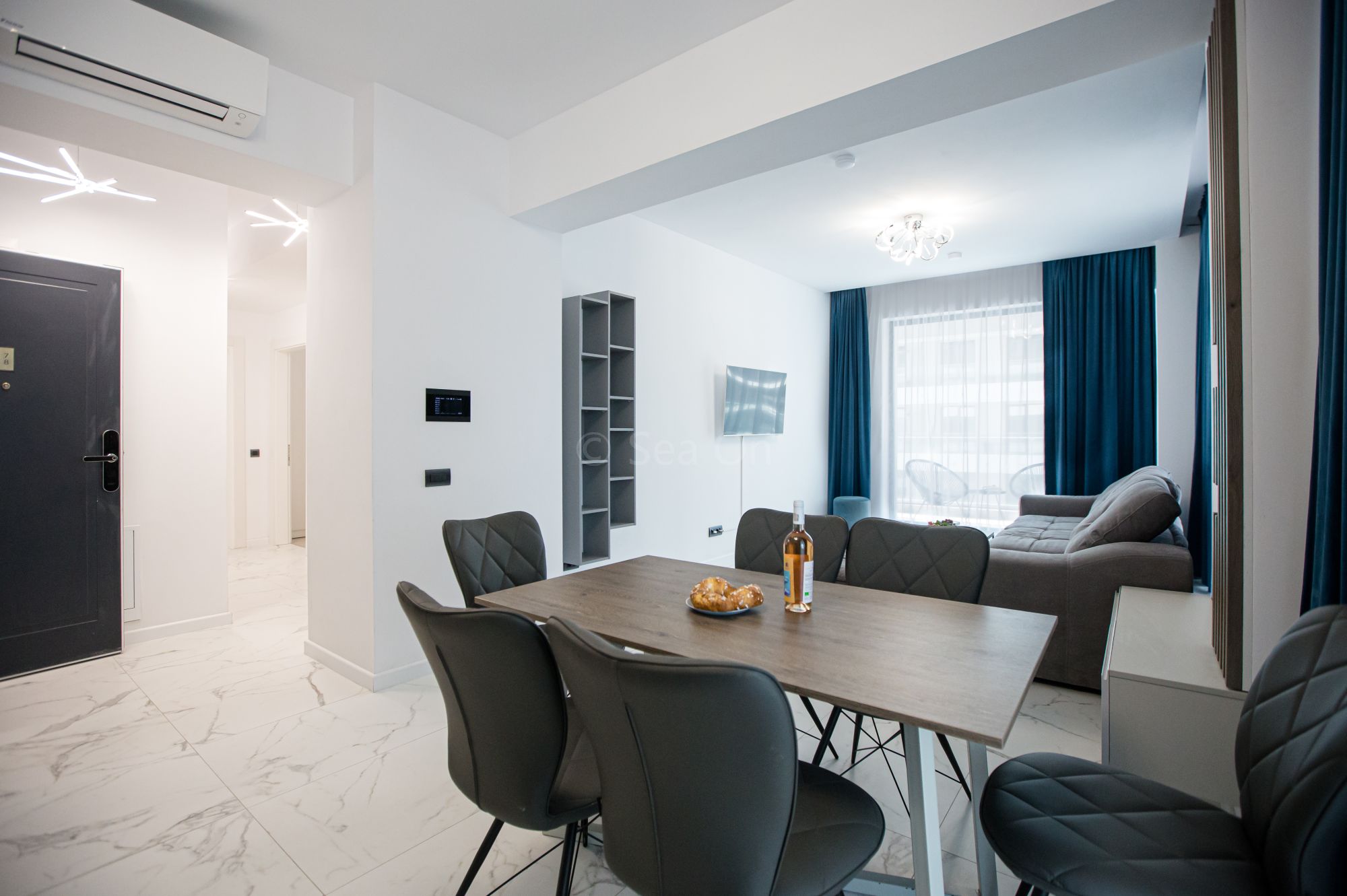 Un apartament cu vedere laterala sau frontala la mare, proiectat inteligent, avand un spatiu generos, design modern si personalizat. Este complet echipat, dispune de sistem Smart Home, mobilier de înaltă calitate, oferind confort, funcţionalitate și răsfăț.