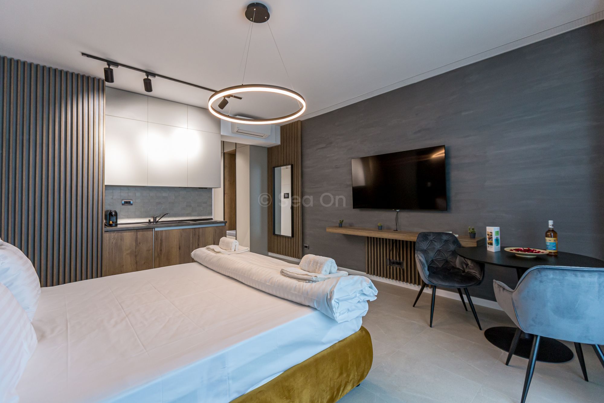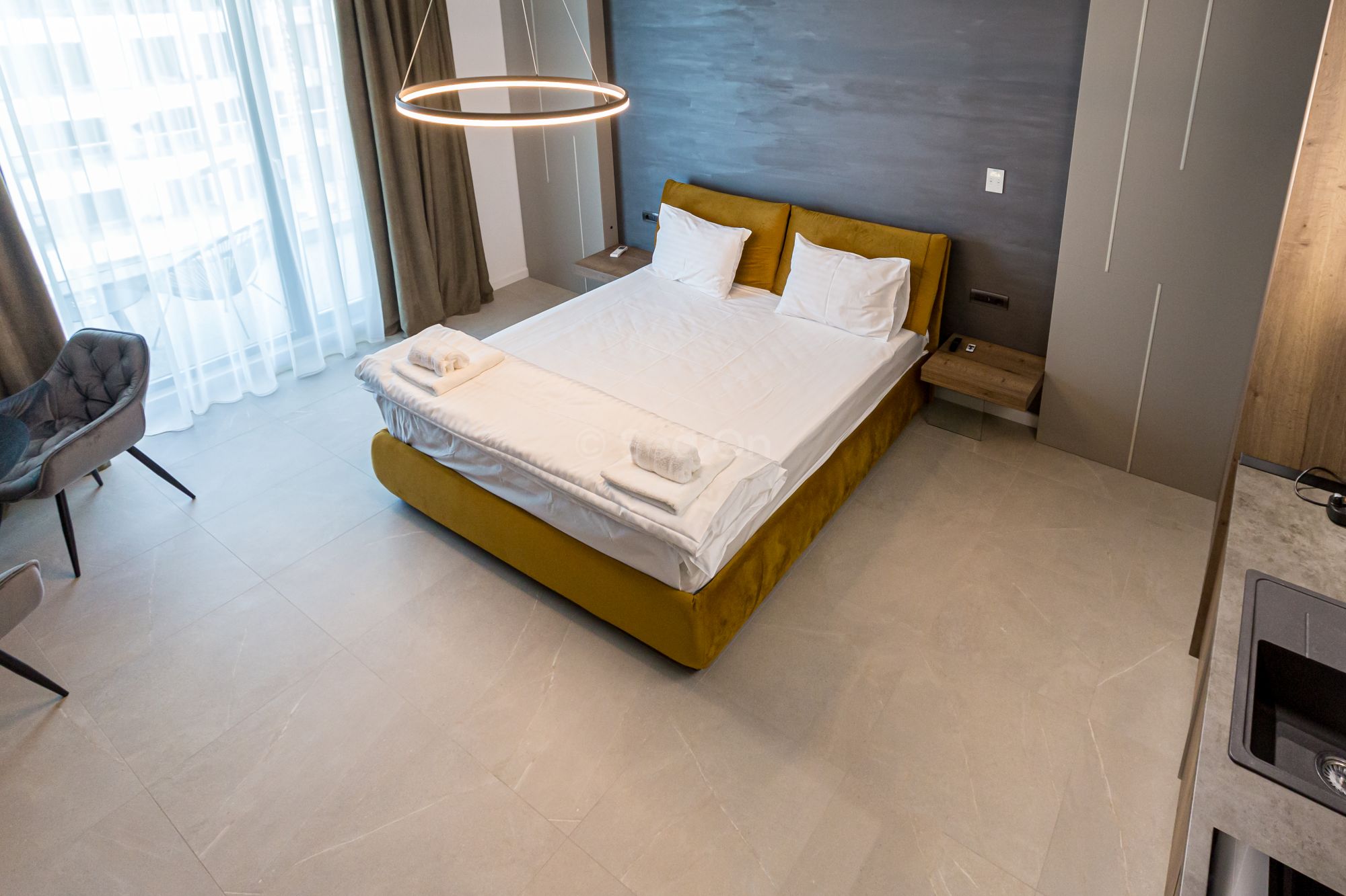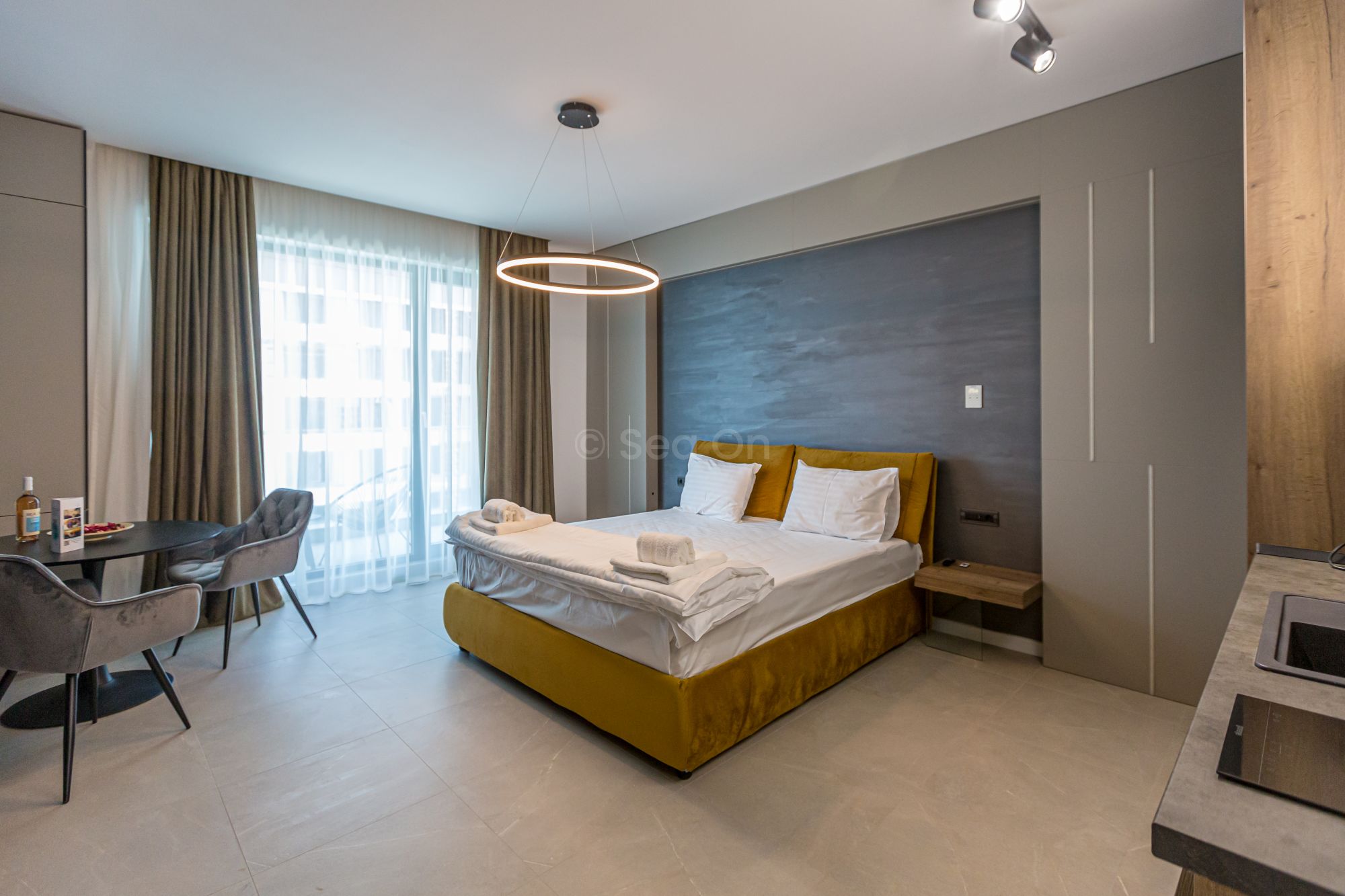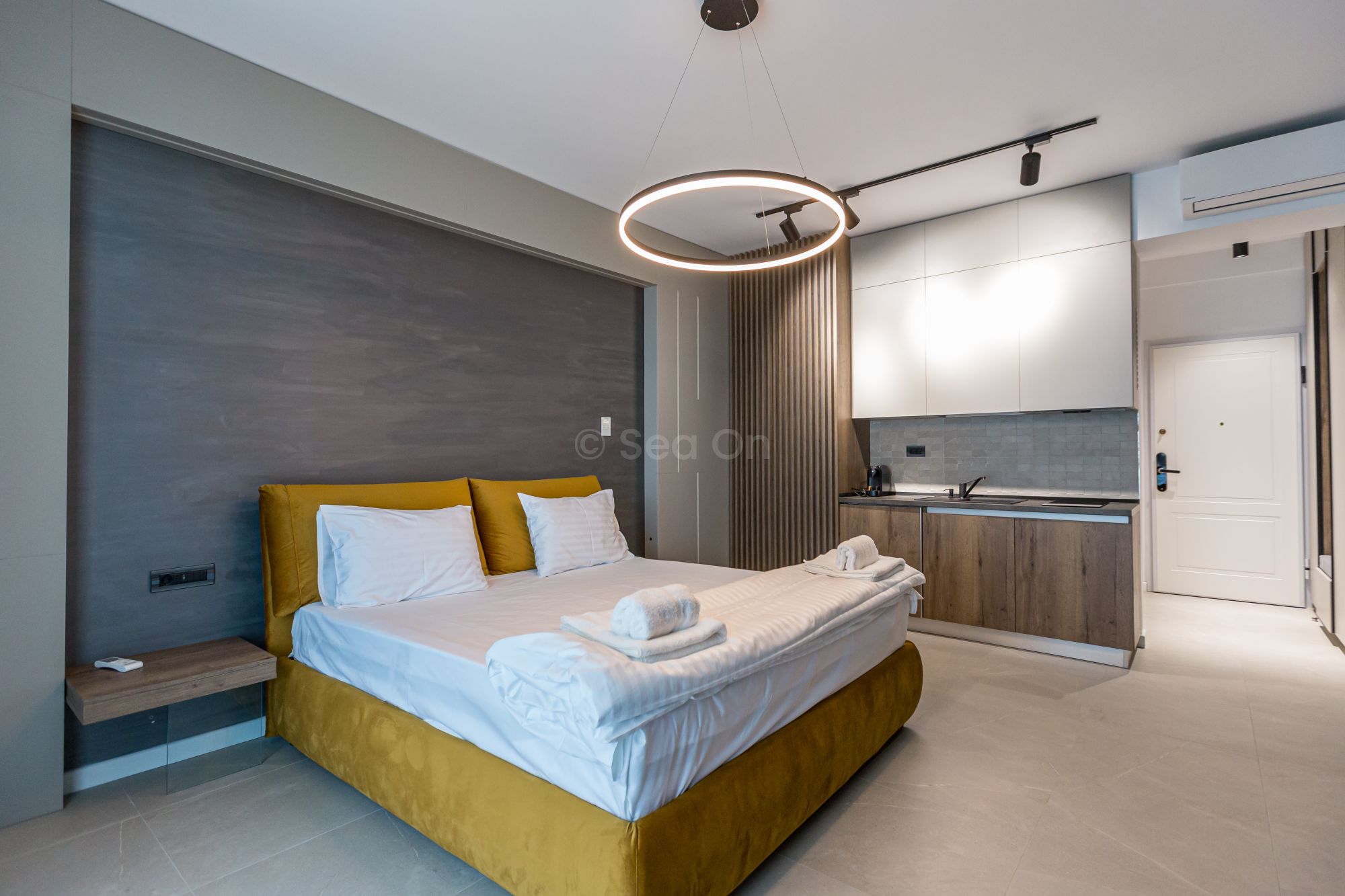 Un studio cu vedere laterala sau frontala la mare, proiectat inteligent, avand un spatiu generos, design modern si personalizat. Este complet echipat, dispune de sistem Smart Home, mobilier de înaltă calitate, oferind confort, funcţionalitate și răsfăț.