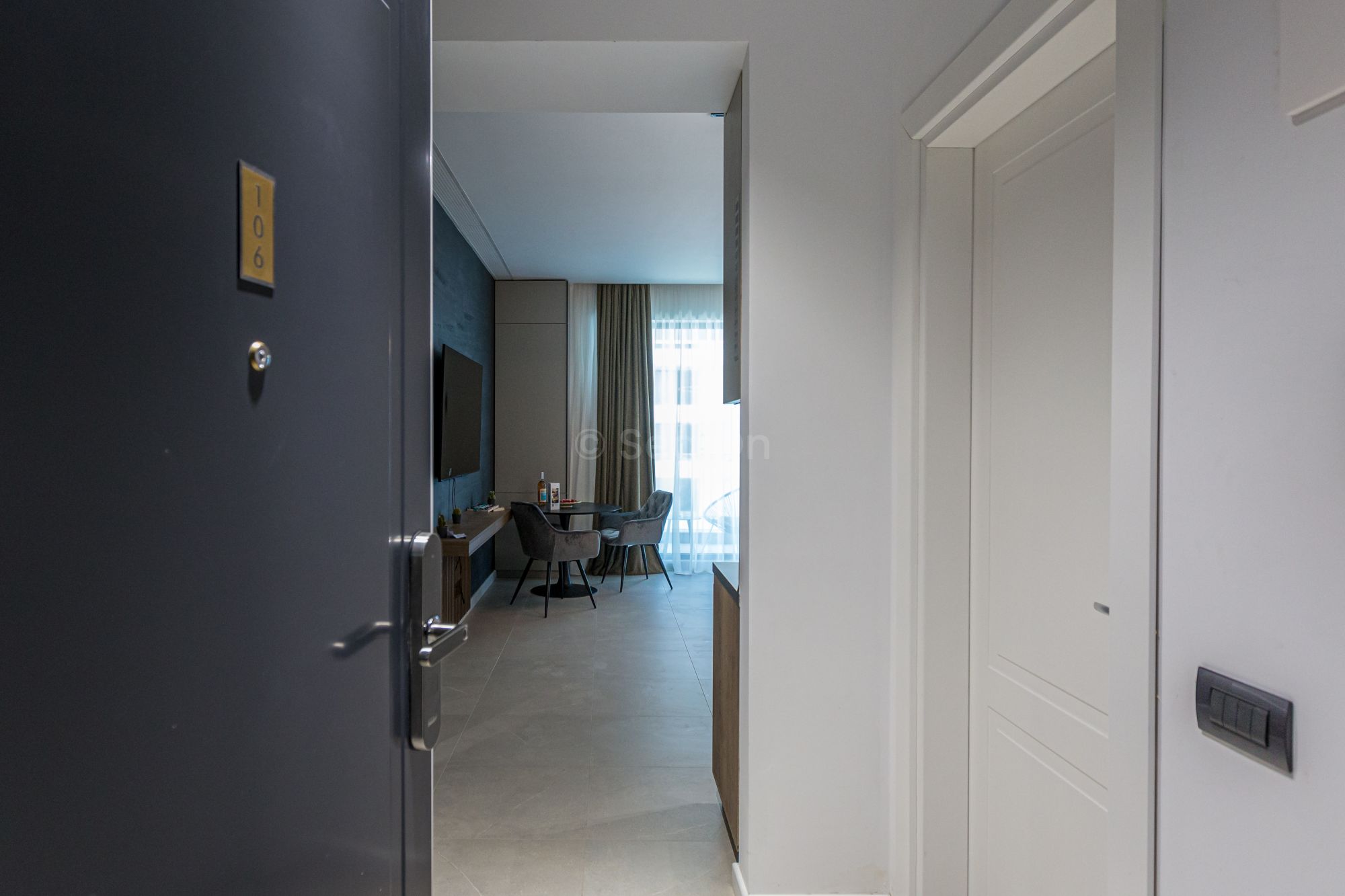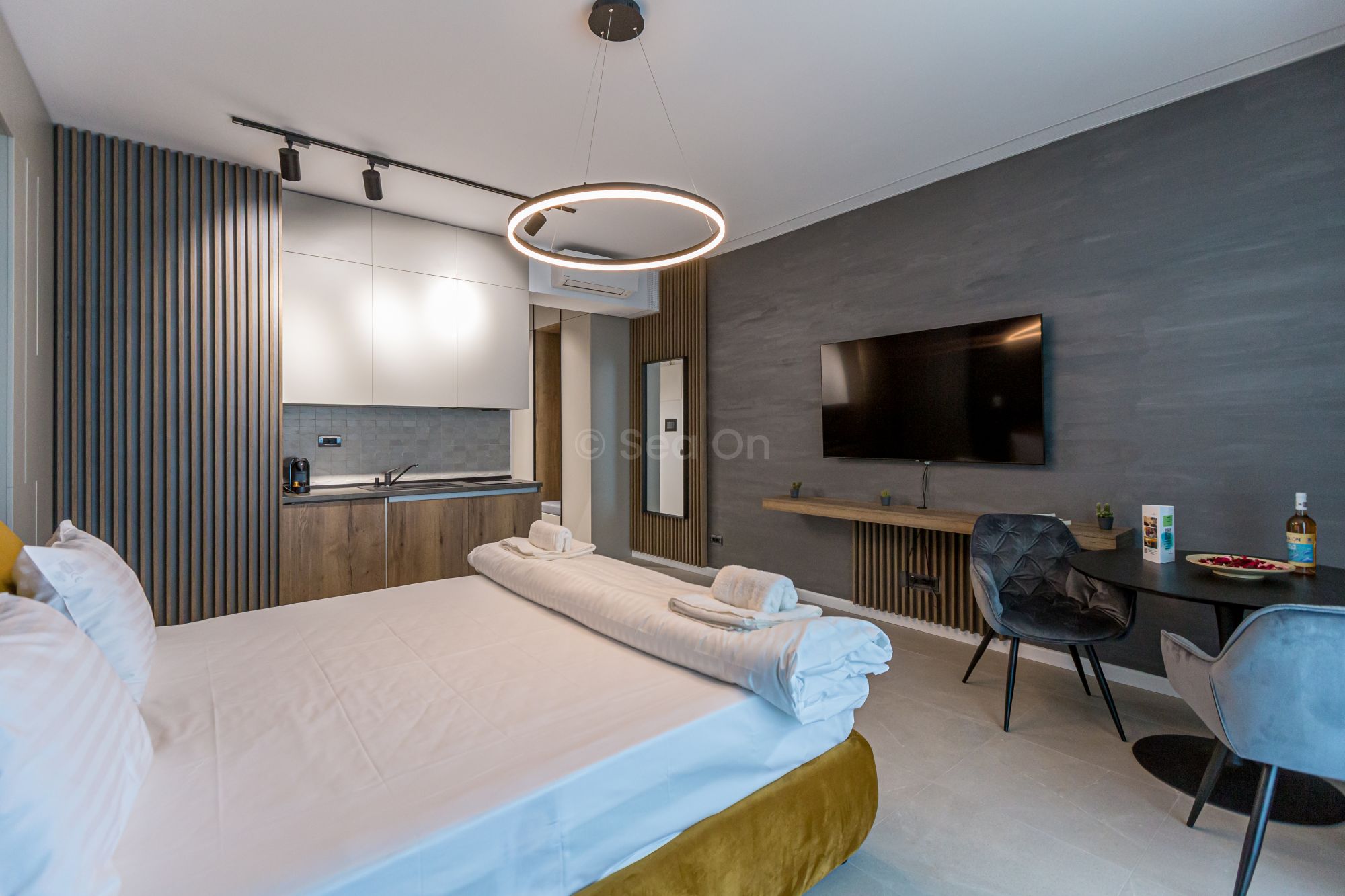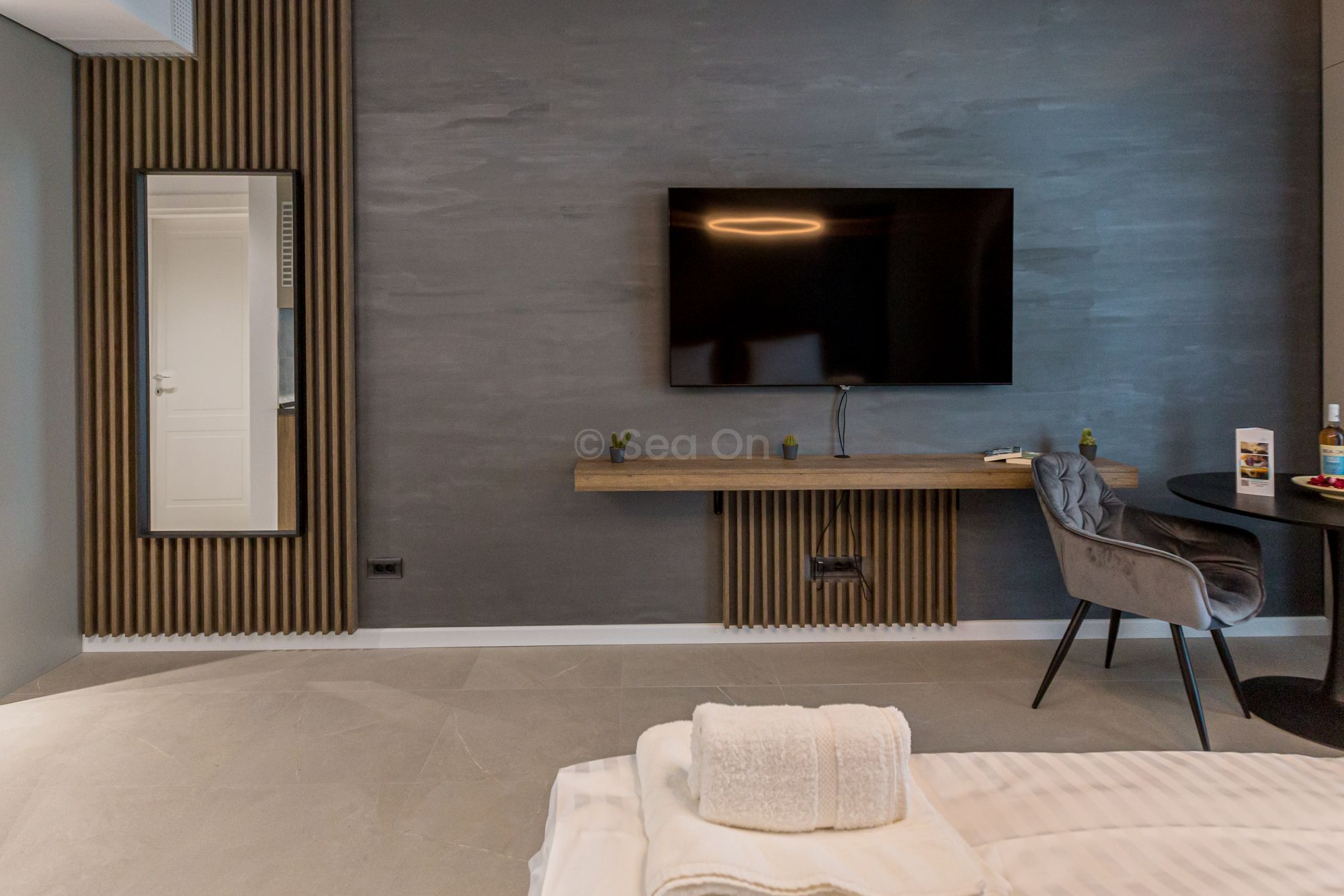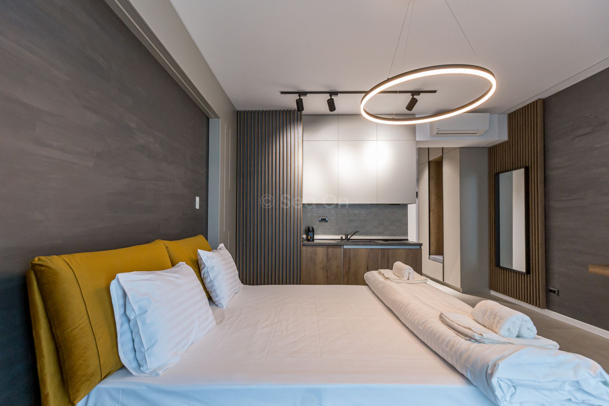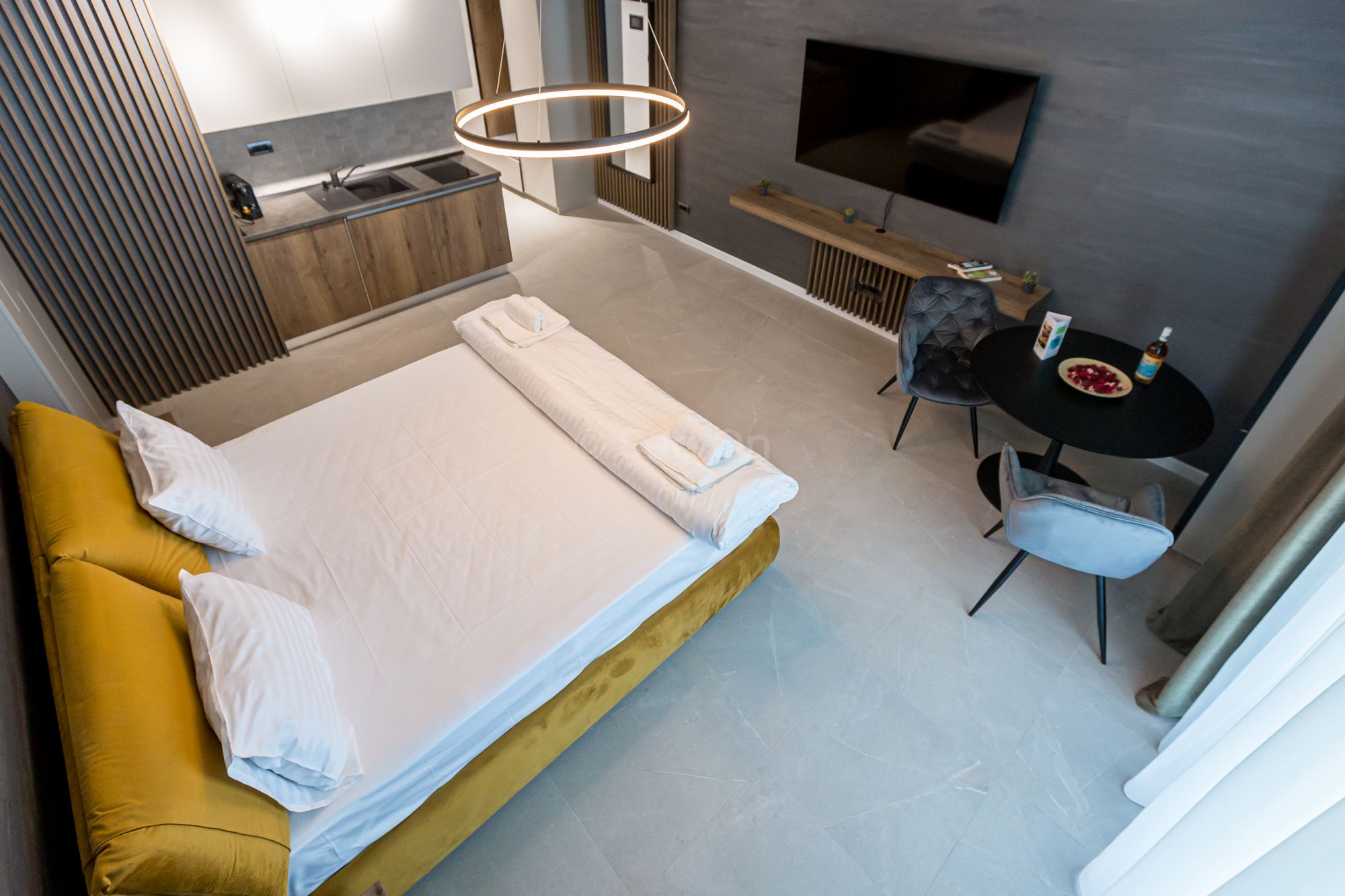 Un studio cu vedere laterala sau frontala la mare, proiectat inteligent, avand un spatiu generos, design modern si personalizat. Este complet echipat, dispune de sistem Smart Home, mobilier de înaltă calitate, oferind confort, funcţionalitate și răsfăț.