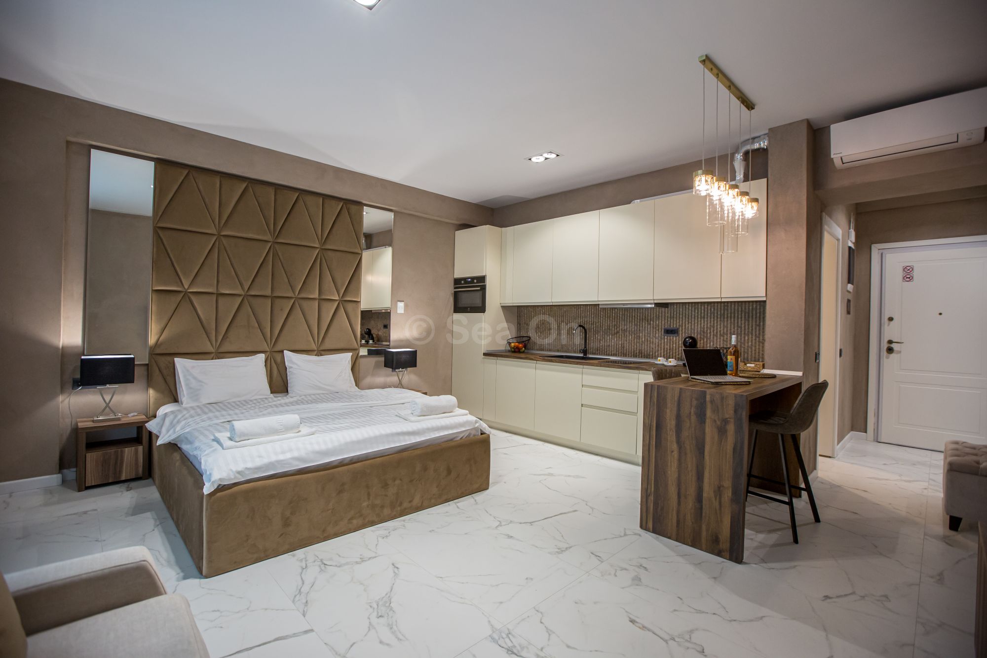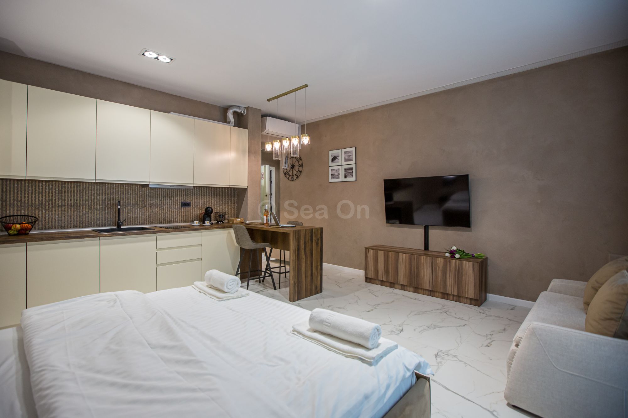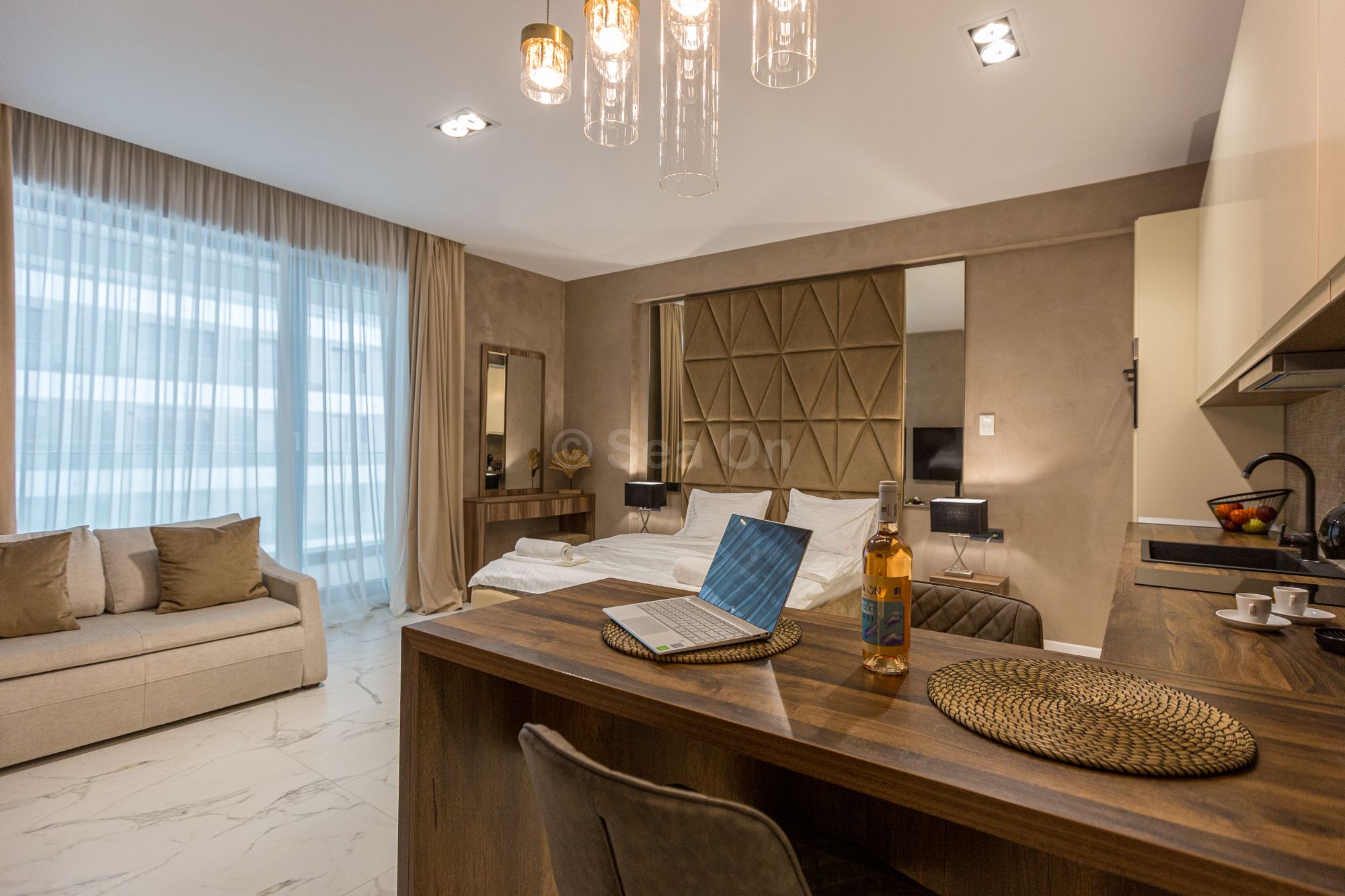 Un studio cu vedere laterala sau frontala la mare, proiectat inteligent, avand un spatiu generos, design modern si personalizat. Este complet echipat, dispune de sistem Smart Home, mobilier de înaltă calitate, oferind confort, funcţionalitate și răsfăț.
