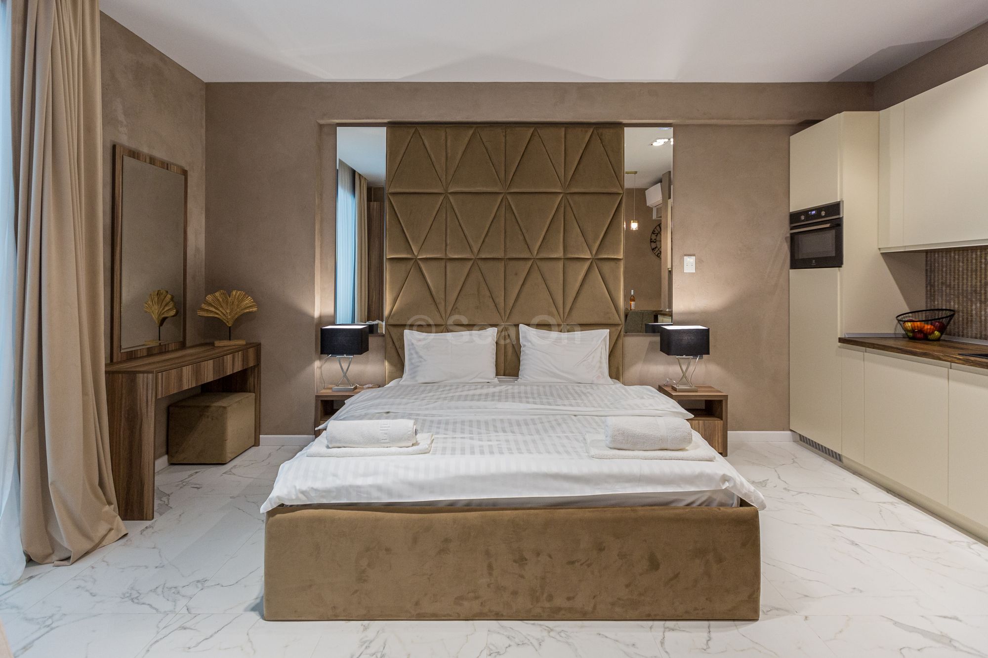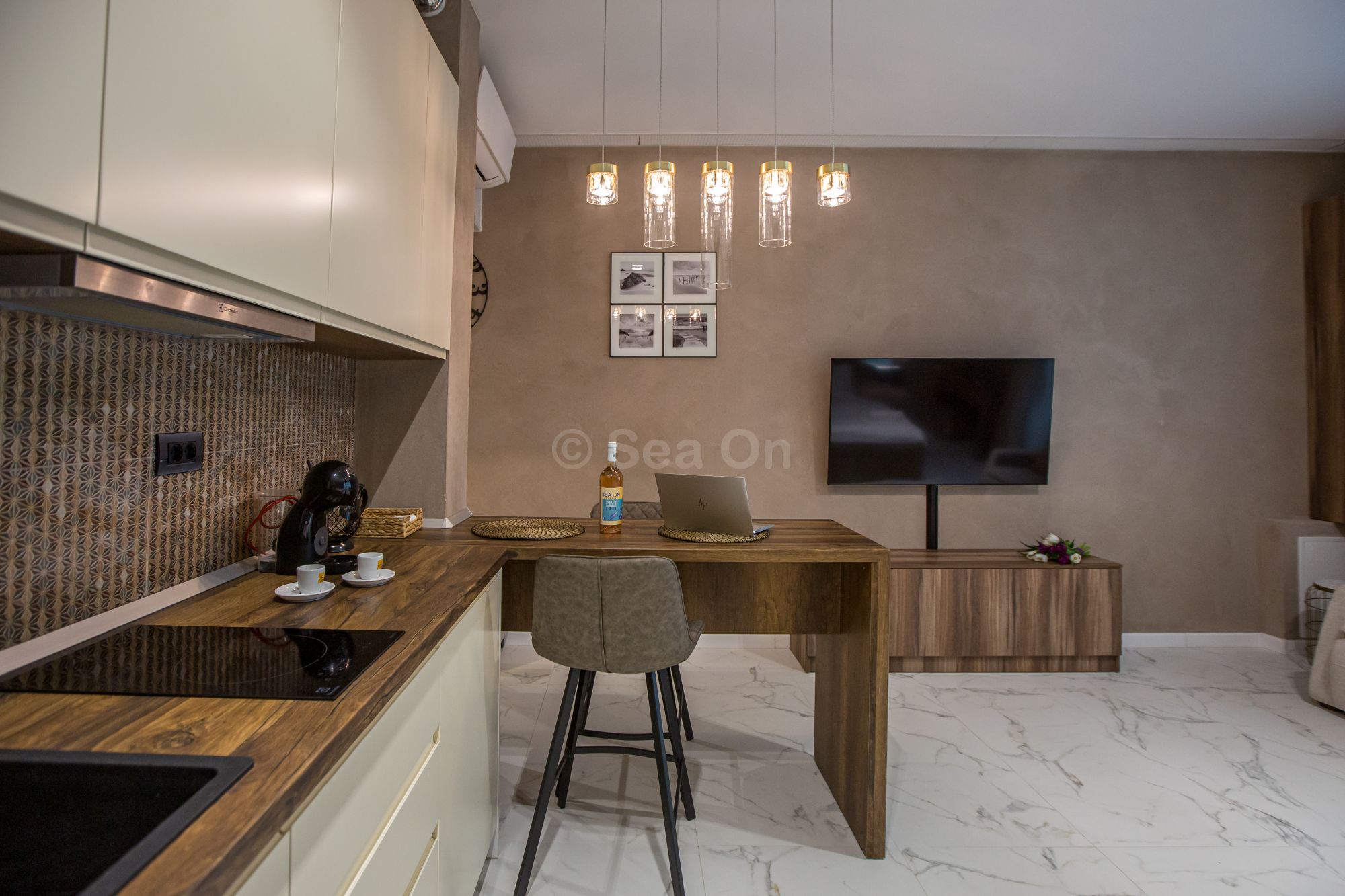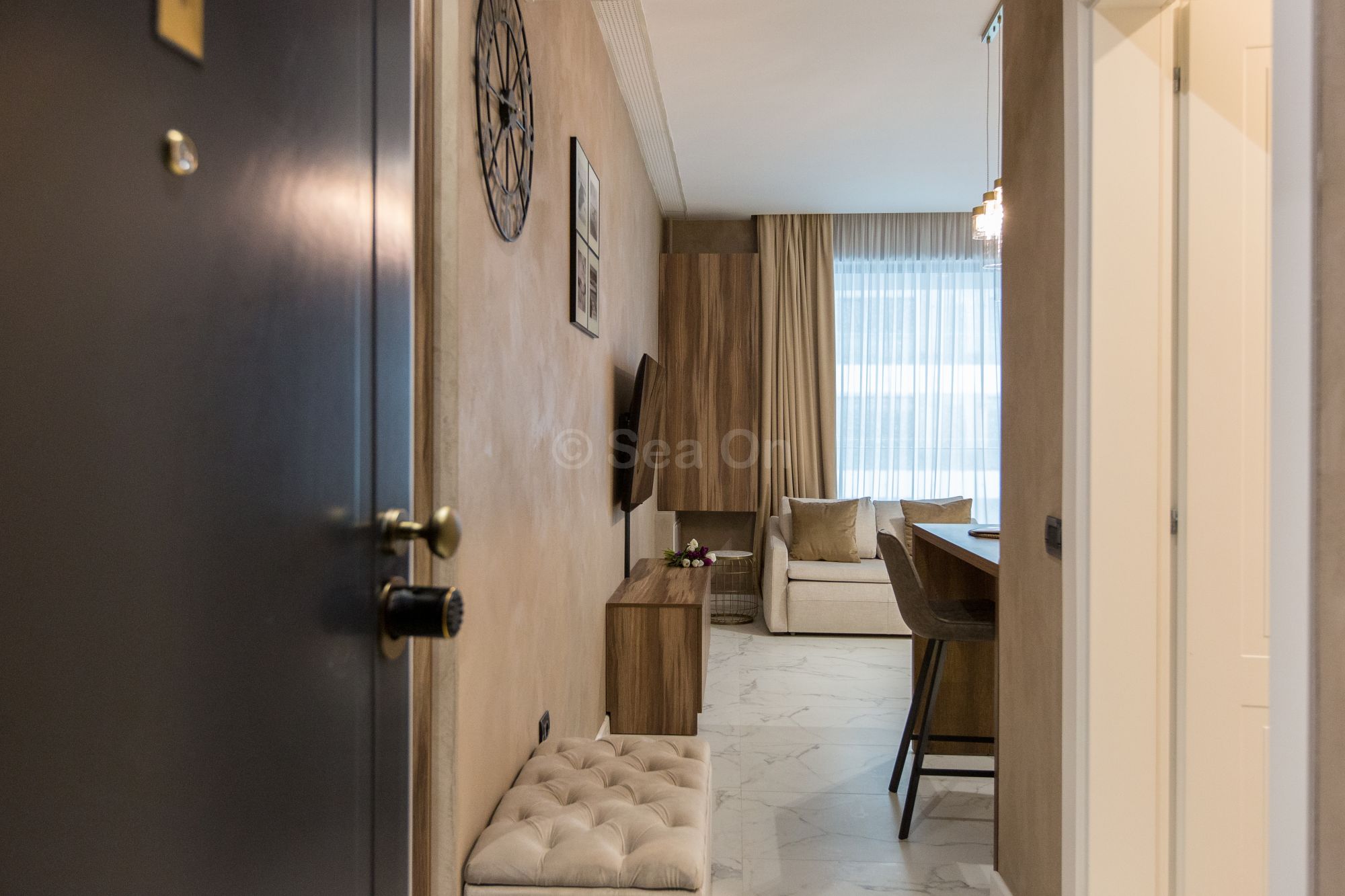 Un studio cu vedere laterala sau frontala la mare, proiectat inteligent, avand un spatiu generos, design modern si personalizat. Este complet echipat, dispune de sistem Smart Home, mobilier de înaltă calitate, oferind confort, funcţionalitate și răsfăț.