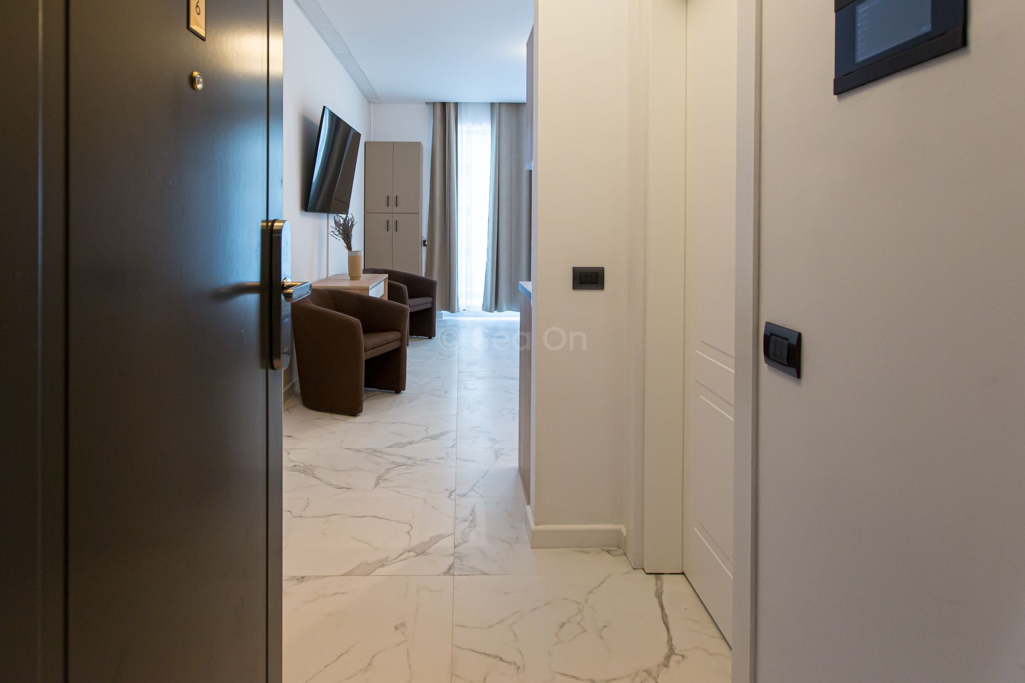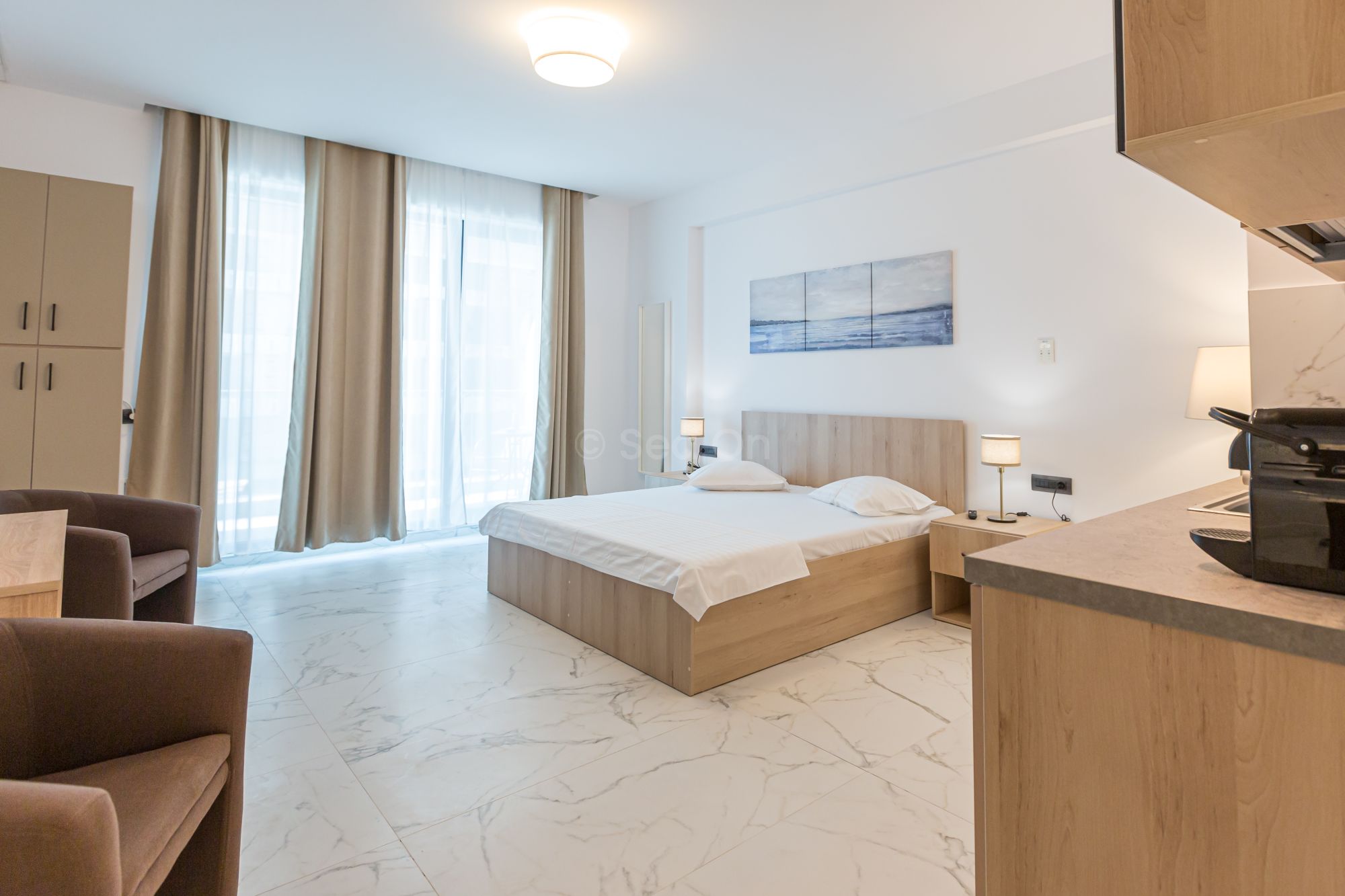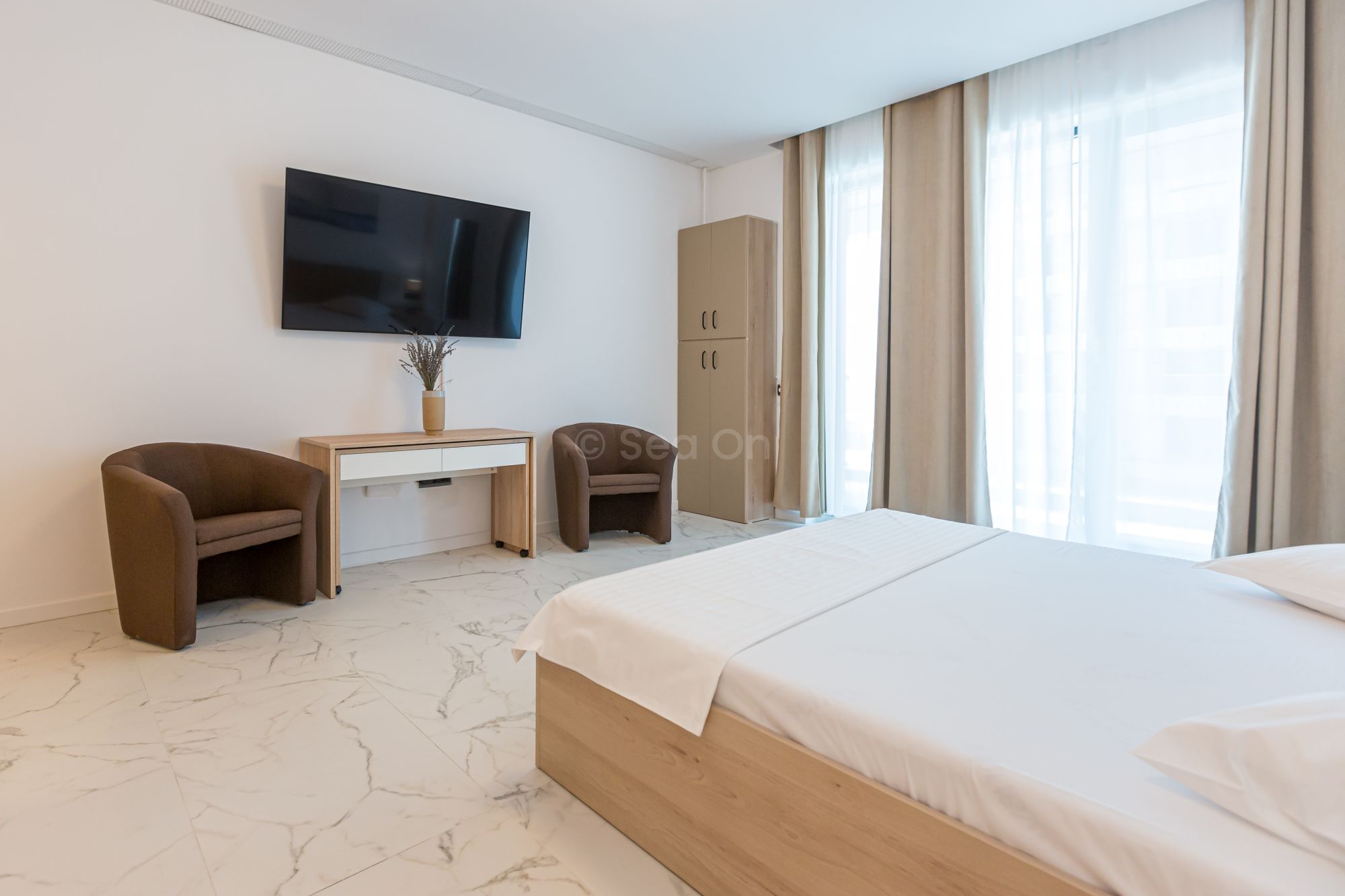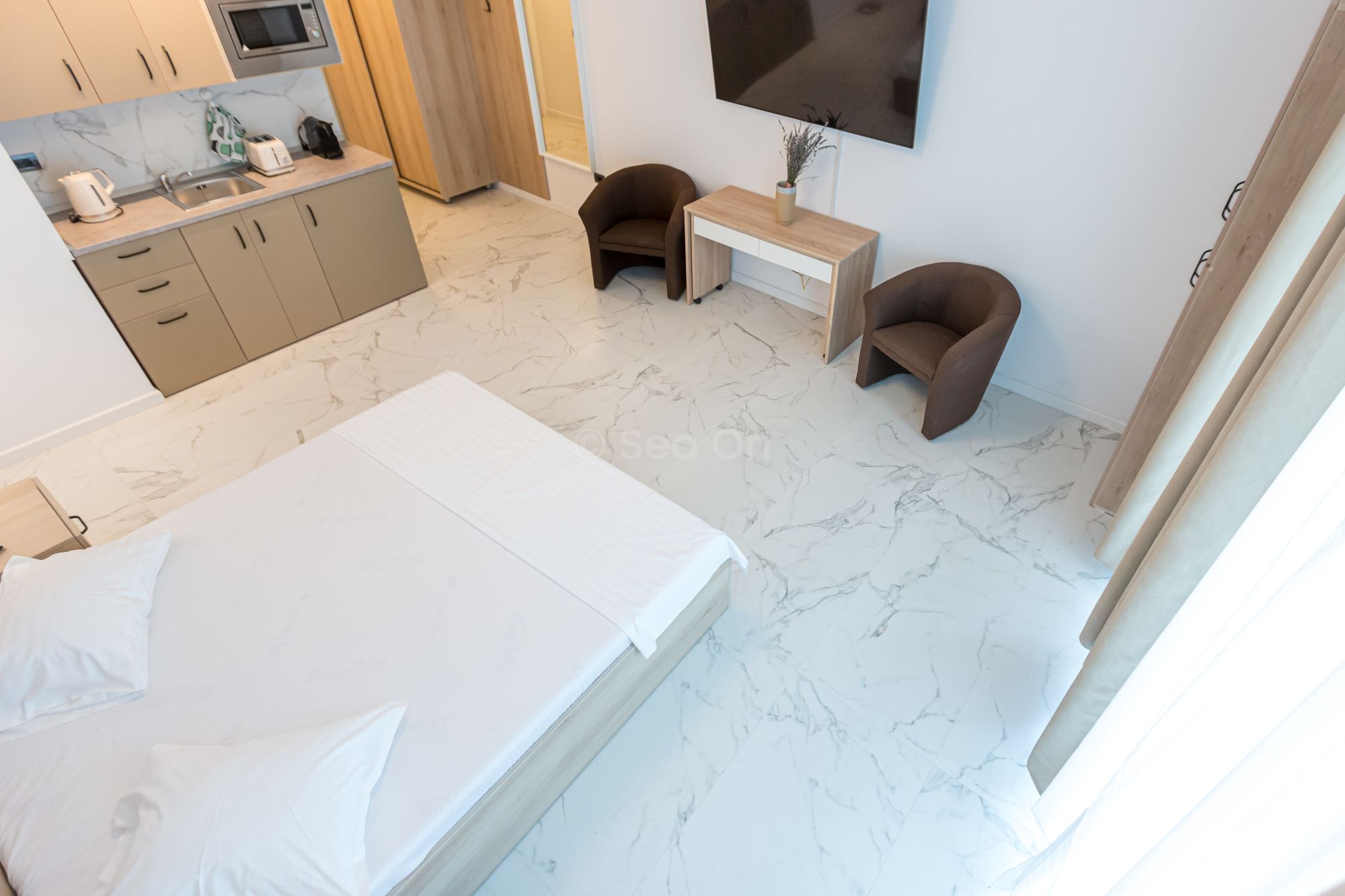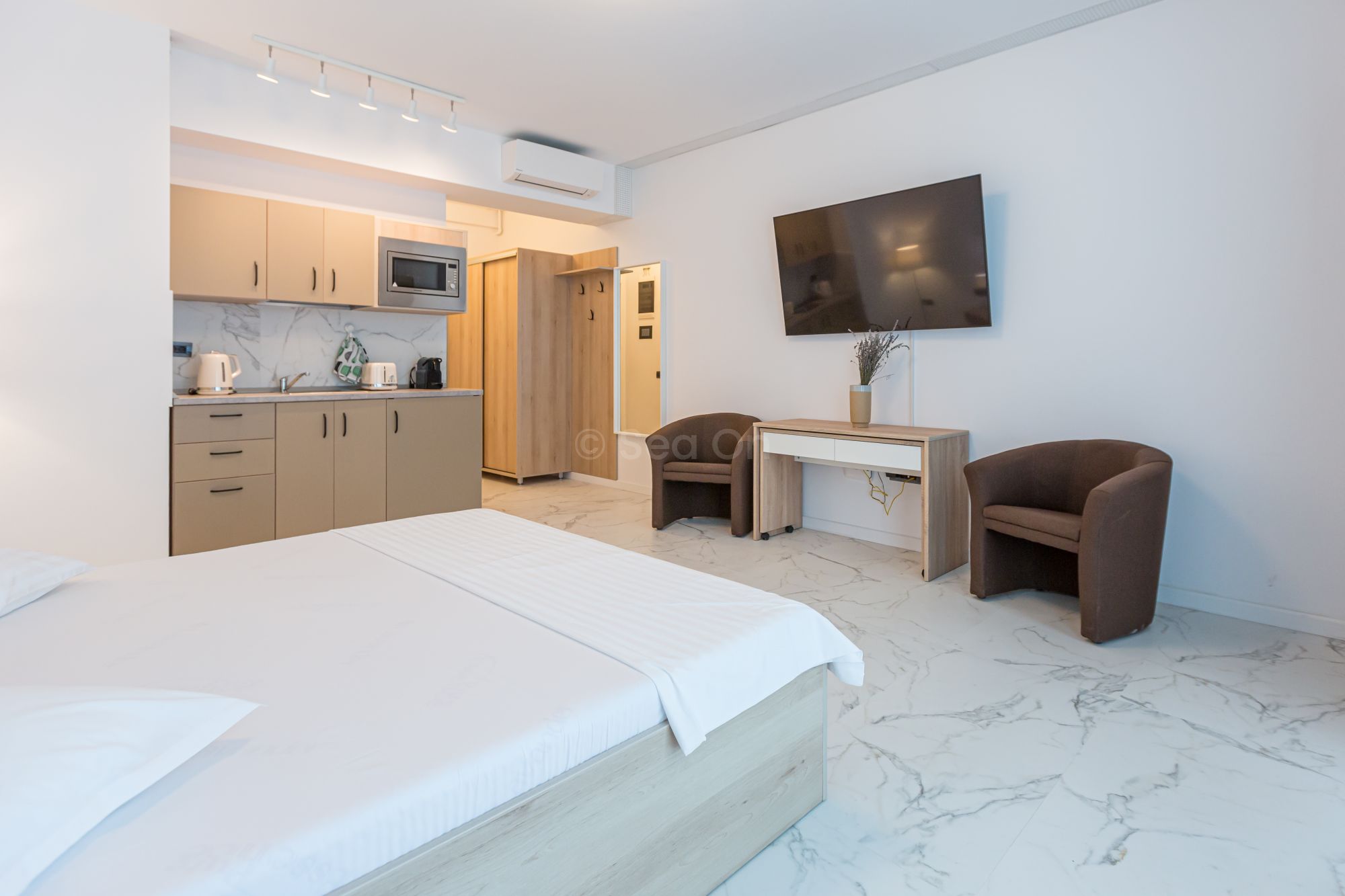 Un studio cu vedere laterala sau frontala la mare, proiectat inteligent, avand un spatiu generos, design modern si personalizat. Este complet echipat, dispune de sistem Smart Home, mobilier de înaltă calitate, oferind confort, funcţionalitate și răsfăț.