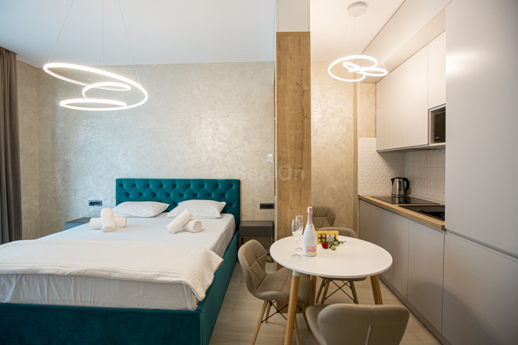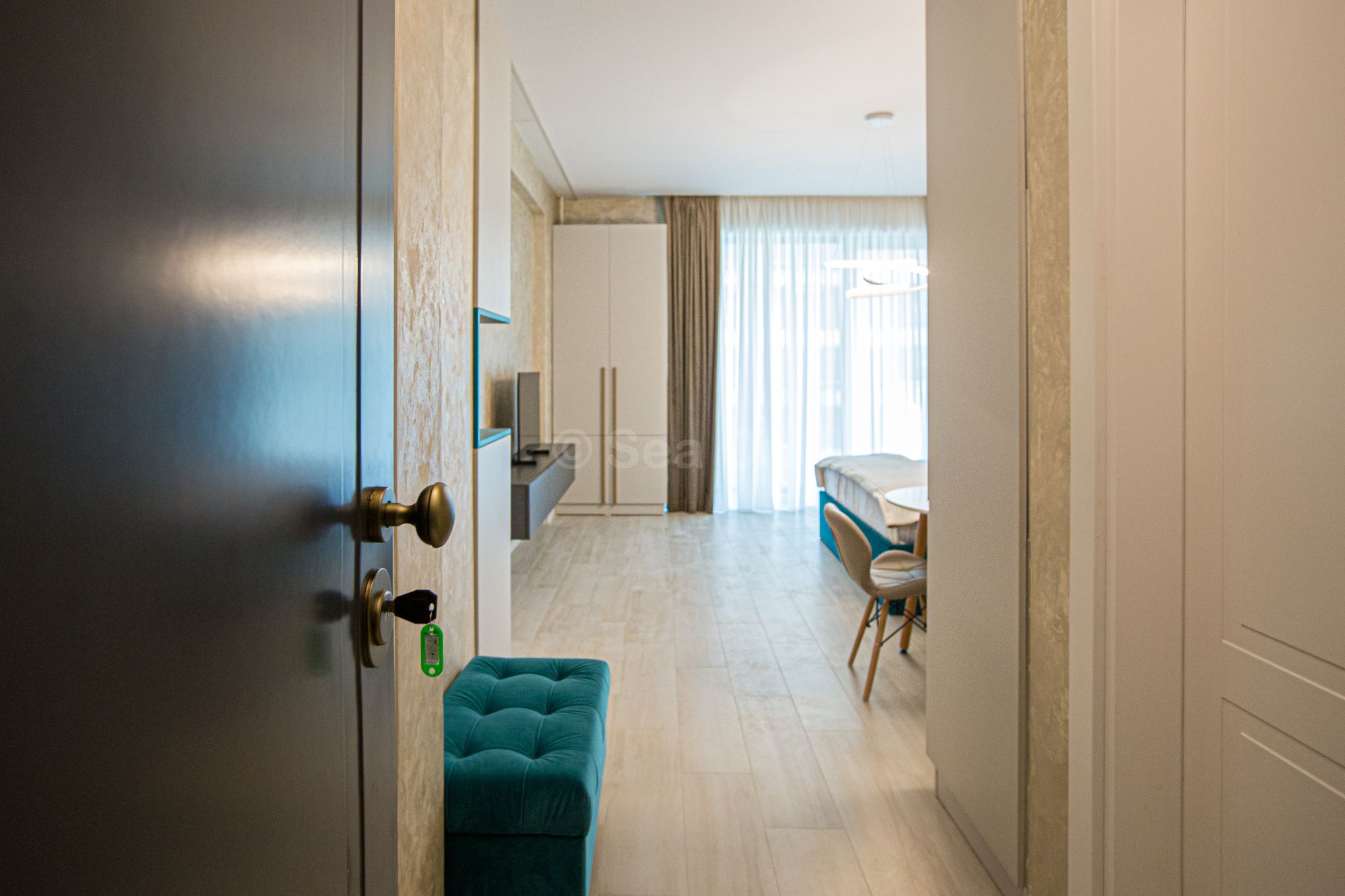 Un studio cu vedere laterala sau frontala la mare, proiectat inteligent, avand un spatiu generos, design modern si personalizat. Este complet echipat, dispune de sistem Smart Home, mobilier de înaltă calitate, oferind confort, funcţionalitate și răsfăț.