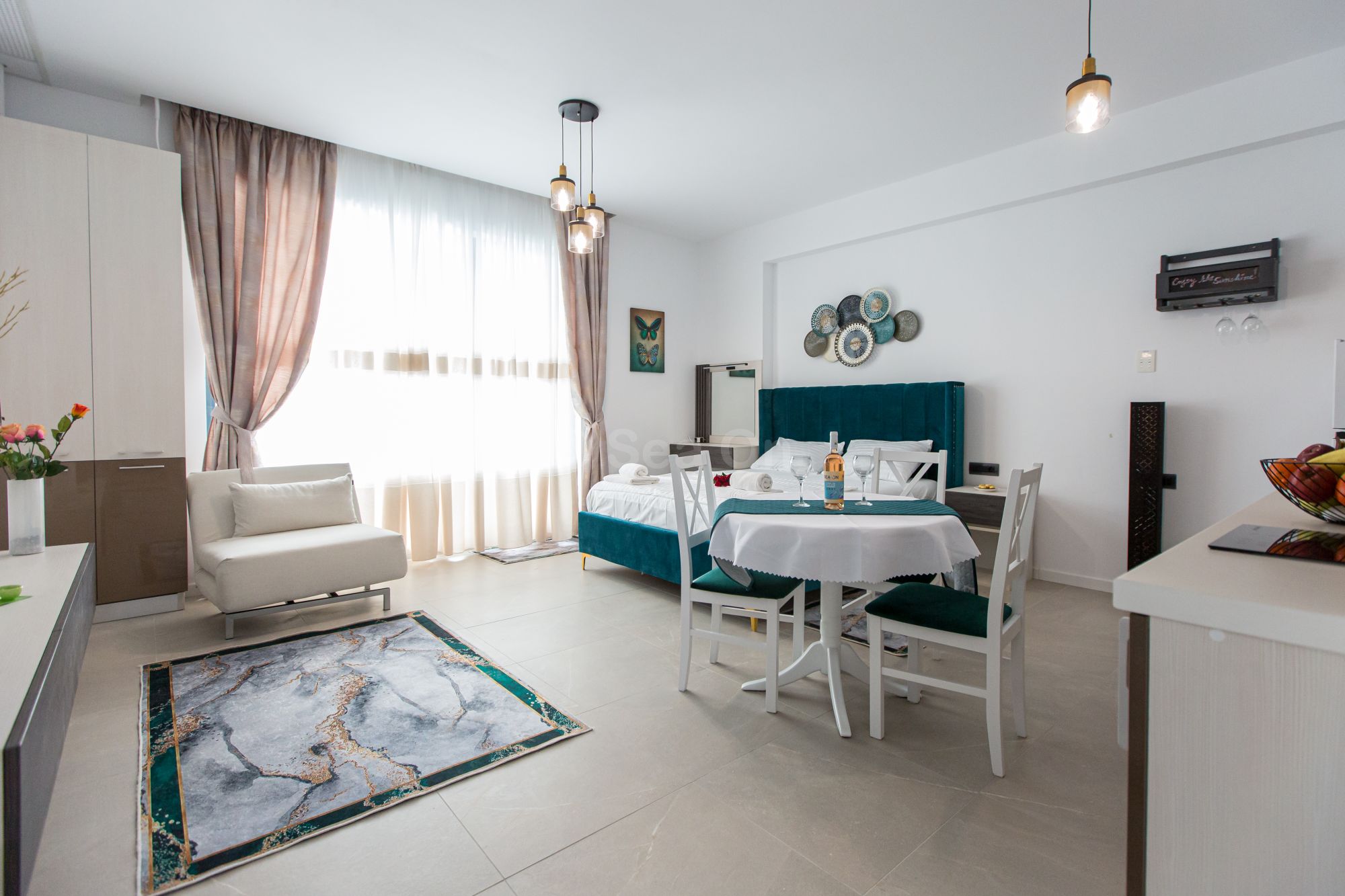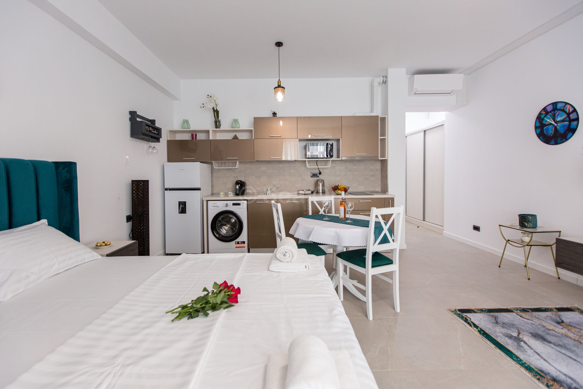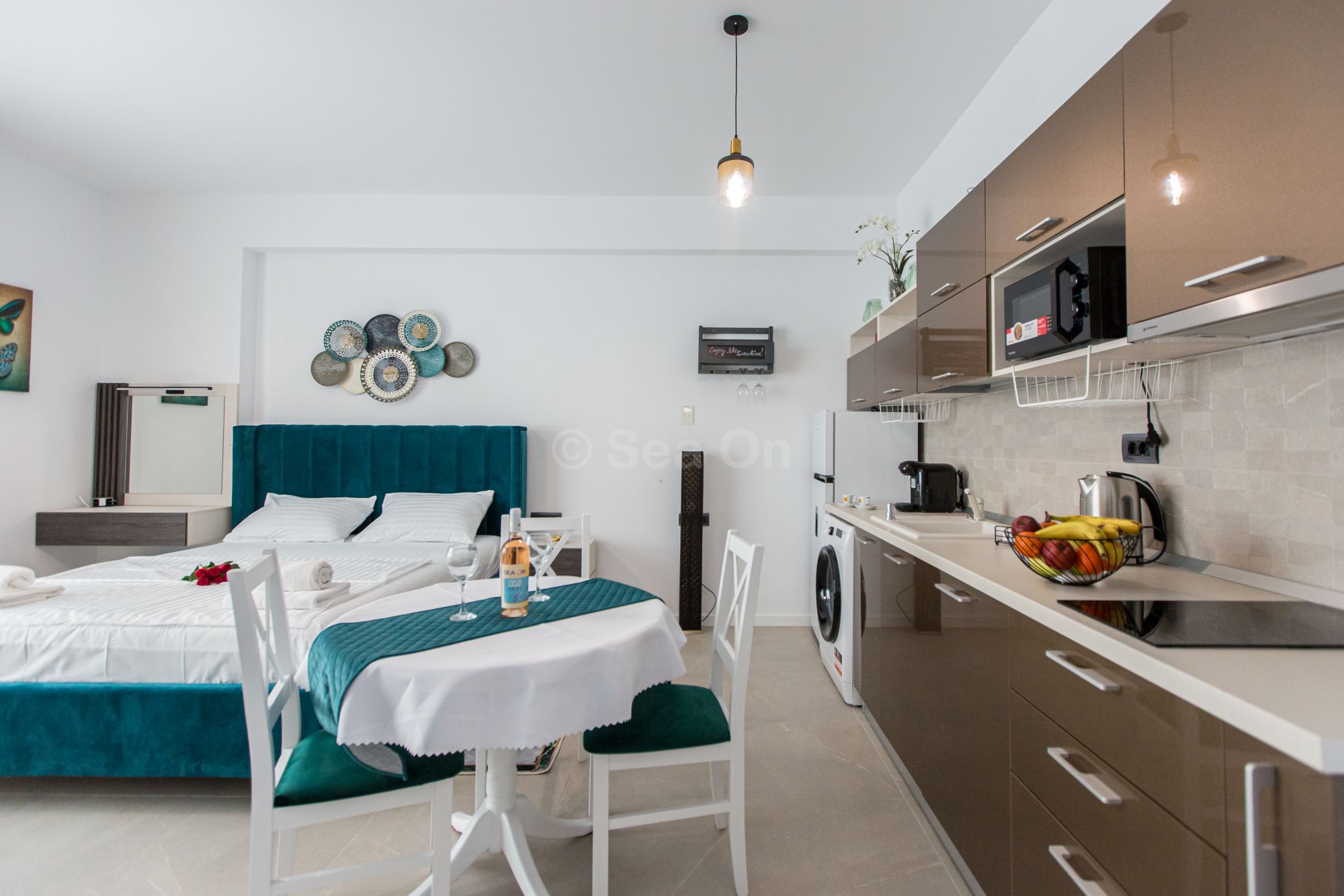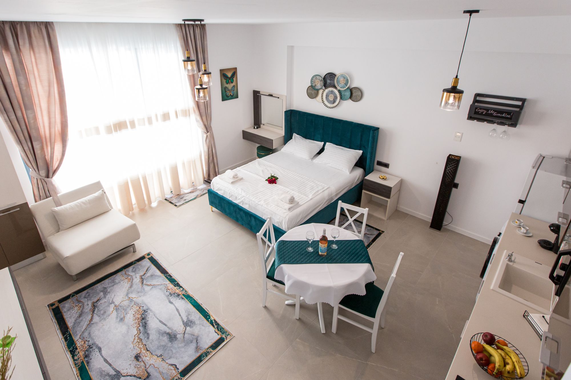 Pune la dispozitie un spatiu deschis, cu bucătărie utilată, loc de luat masa şi zonă de dormit. Patul este primitor, cu saltea de înaltă calitate şi aşternuturi din materiale premium, pentru maximum de relaxare şi odihnă.