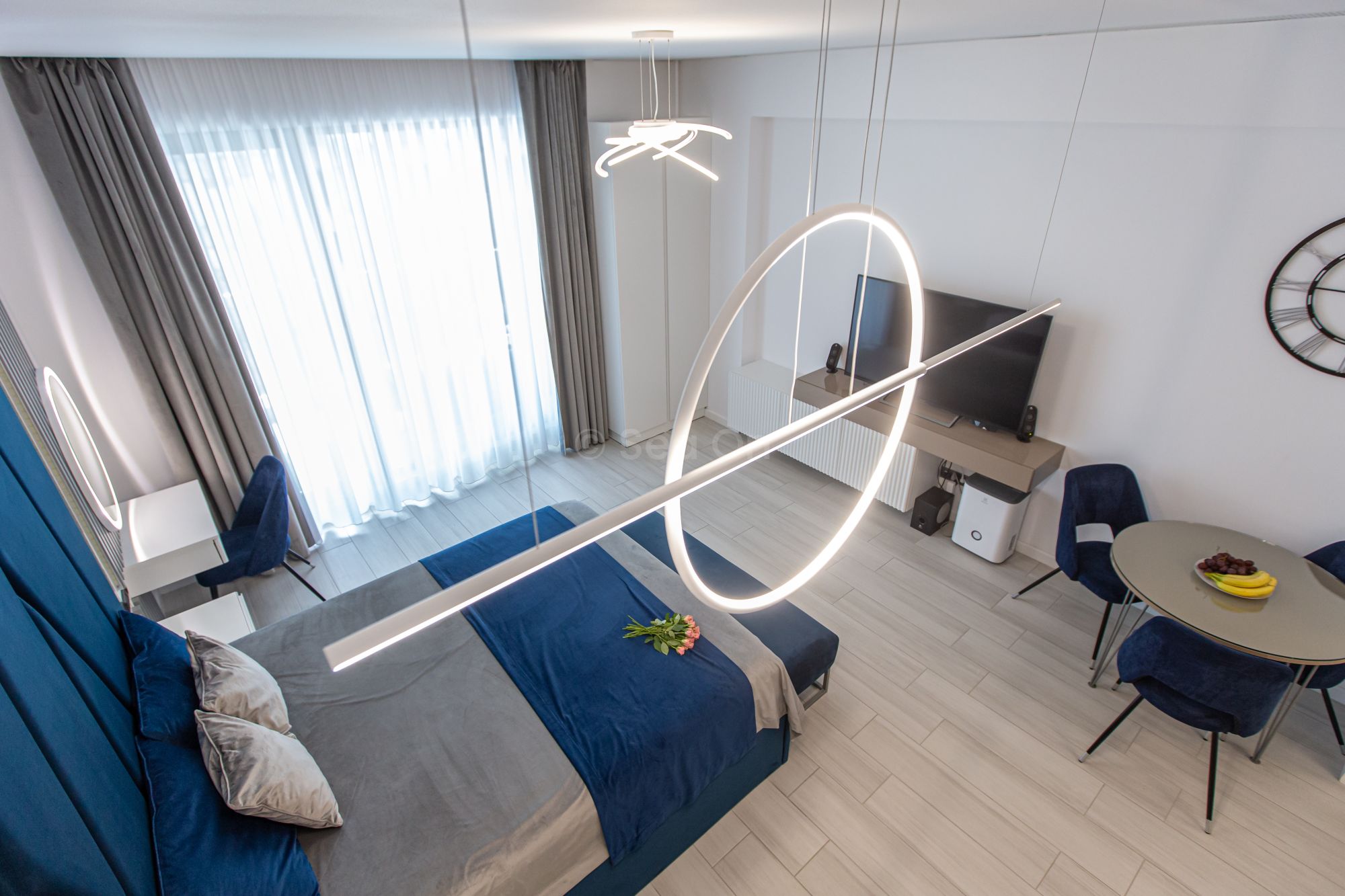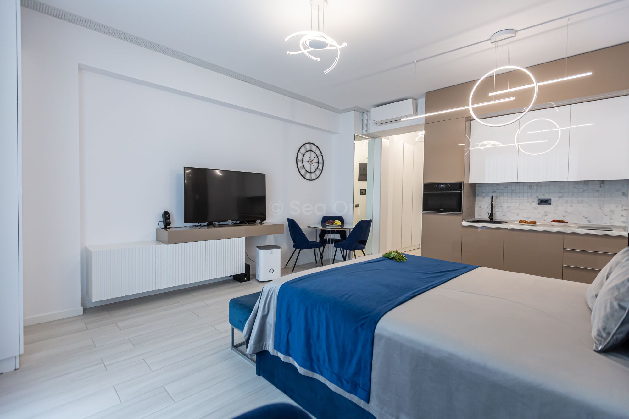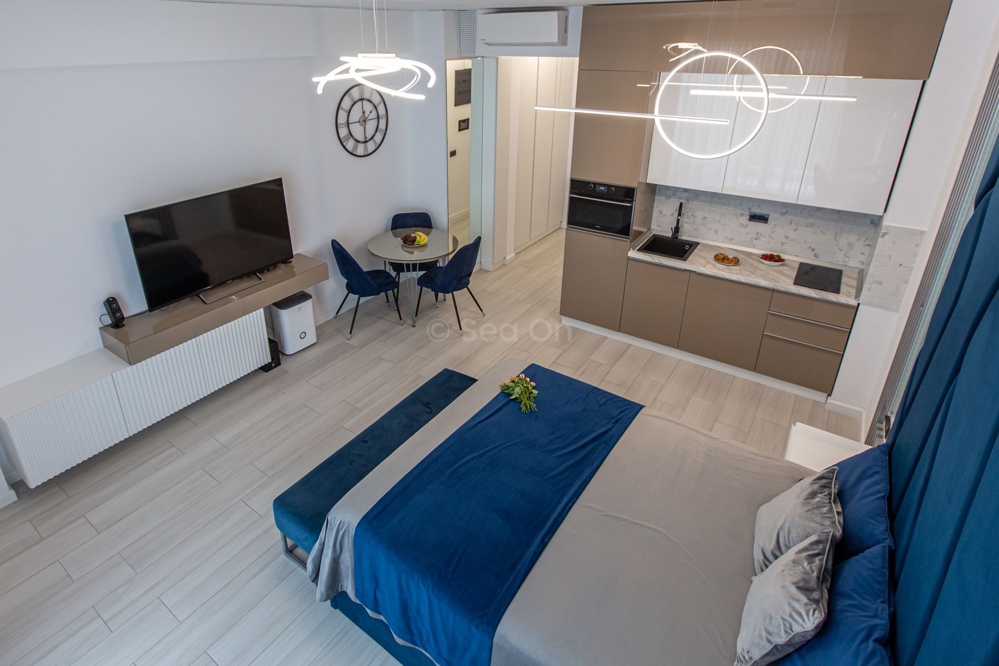Un studio cu vedere laterala sau frontala la mare, proiectat inteligent, avand un spatiu generos, design modern si personalizat. Este complet echipat, dispune de sistem Smart Home, mobilier de înaltă calitate, oferind confort, funcţionalitate și răsfăț.